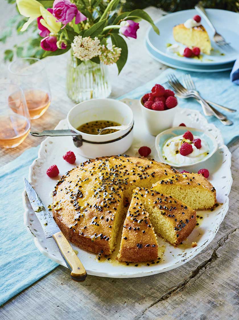To make the passion fruit syrup, place the sugar and 150ml water in a saucepan and heat gently to dissolve the sugar. Add the passion fruit pulp and bring to the boil. Allow to simmer gently for 8-10 minutes until slightly reduced and thickened. Spoon all but a few tablespoons over the cake and allow to infuse until cold.