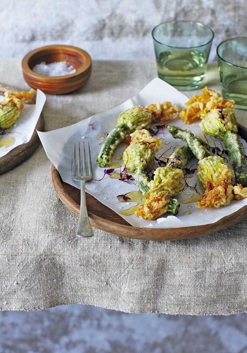 Pour the oil into a large, heavy- based saucepan; it needs to come at least halfway up the sides. Place over a high heat until it reaches 180C – to test it’s ready, drop a bit of the batter in: if it sizzles and bubbles to the top, it’s ready. Lightly coat the courgette and flowers in the batter and lower into the oil. Do this in batches so they don’t stick, and be careful when lowering in as the hot oil will spit. Fry for about 2 minutes until light- golden brown and crispy. Using a slotted spoon, transfer to kitchen paper to drain off the excess oil.