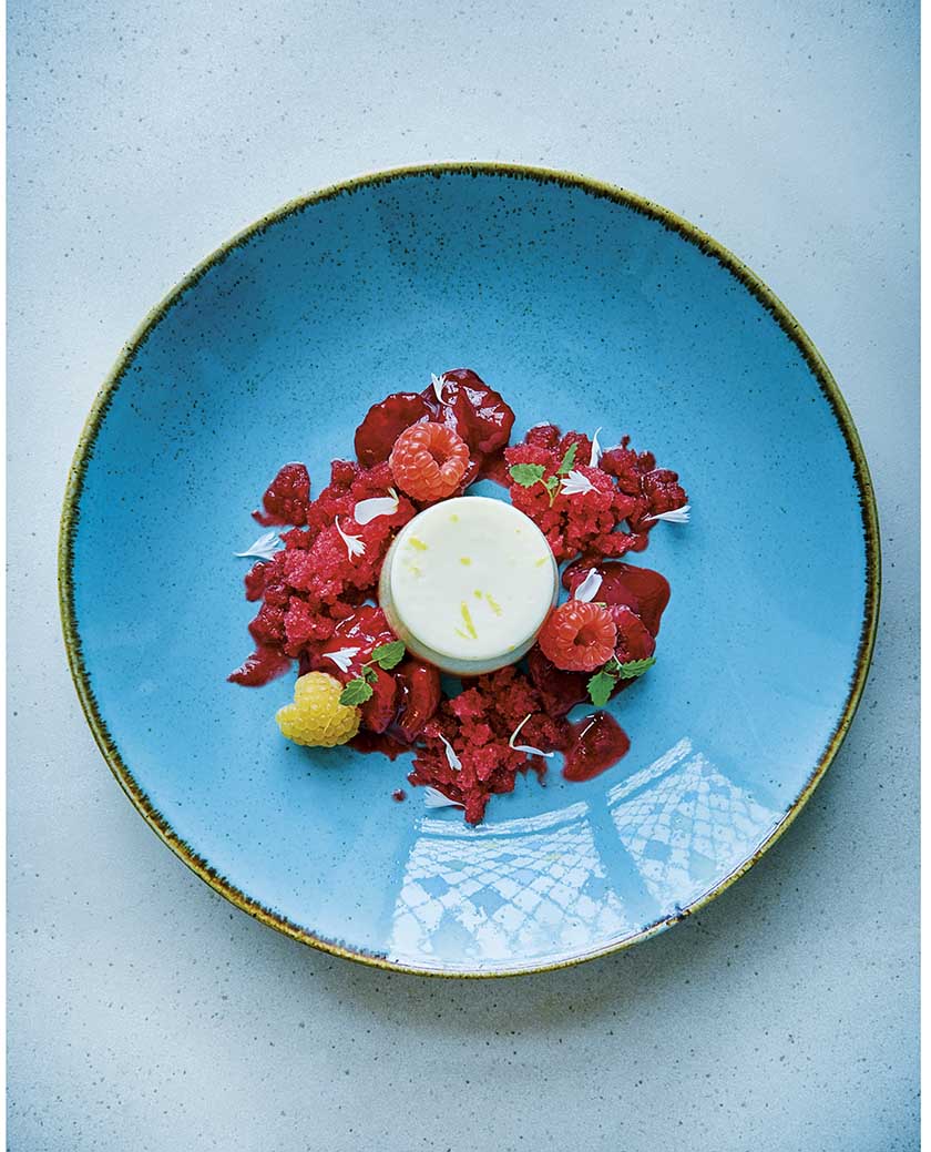 Decorate with the extra lemon zest. Spoon the granita around the panna cotta and decorate with the raspberries, edible flowers and herb sprigs and serve.