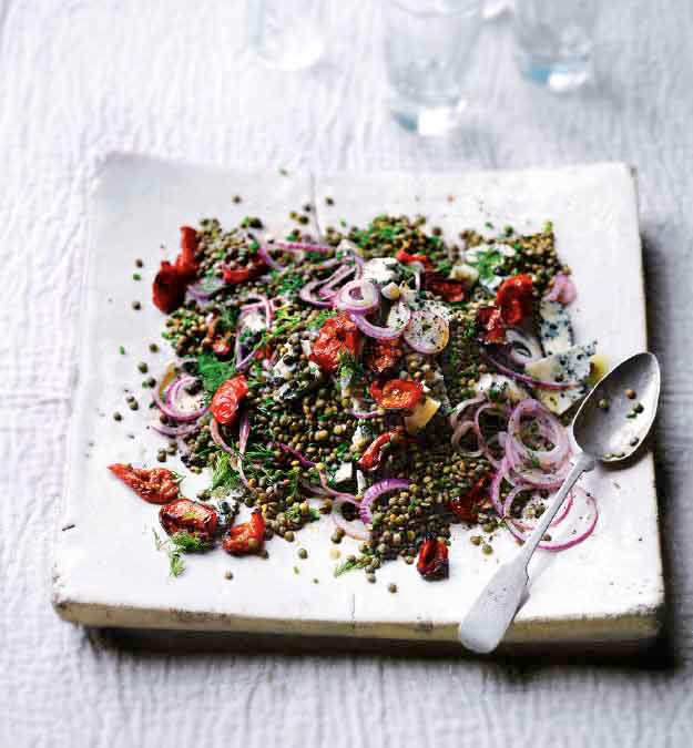 Place the lentils in a pan of boiling water (the water should come 3cm above the lentils) and cook for 20-30 minutes or until tender. Drain well in a sieve and, while still warm, add to the onion. Also add the olive oil, garlic and some black pepper. Stir to mix and leave to cool. Once cool, add the herbs and gently mix together. Taste and adjust seasoning.