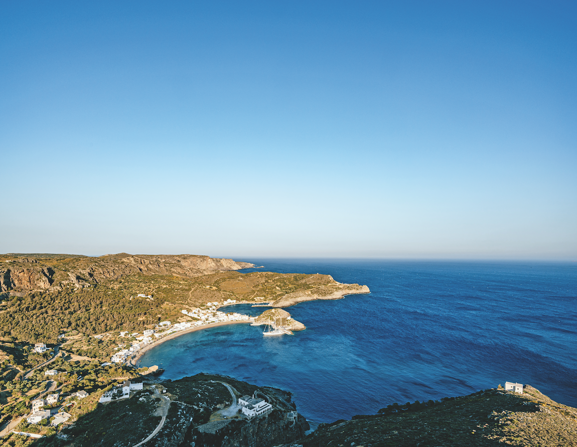 And the food? ‘Really good,’ he says. ‘There are old classic tavernas serving simple salads of tomatoes, olive oil and rusks; and the seafood and meat is good. The new generation have created some nice spots. For instance, in the capital, Chora, there’s a small pizzeria that is really, really good. It’s not Greek, but when you’re on holiday you don’t want lamb every day.’ He name-checks other places on the island: Skandeia Restaurant, located in an old vineyard; Maria’s Pastry Shop in Livadi; and Astikon in Potamos for late-night drinks.