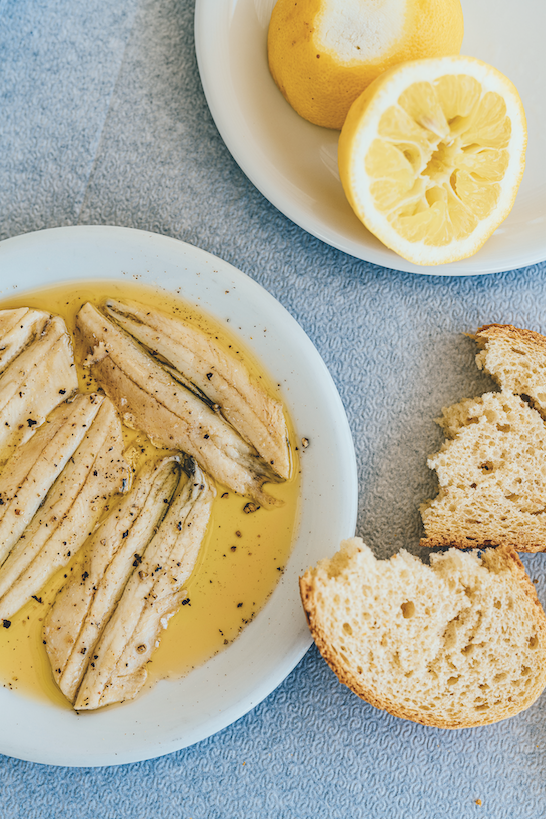 From Kythira, Nikos takes us north-east to the island of Evia, and the seaside town of Karystos. ‘I’ve been going there since I was a baby – my grandmother was from there,’ he explains. ‘It’s only about two hours from Athens but it feels as if you’re a world away. It’s a place close to my heart. It’s for families, it’s not fancy, but it has this harbour with a pier, a lighthouse and lots of small fishing boats – we fishthere a lot. There’s a castle and a big square where all the kids play, with cafés all around it selling souvlaki, seafood, wine, ouzo, or doughnuts with thyme honey and cinnamon. It’s great for hiking or cycling – there are mountains and lots of small villages, such as Aetos, Myloi and Grabias, which are great for food.’