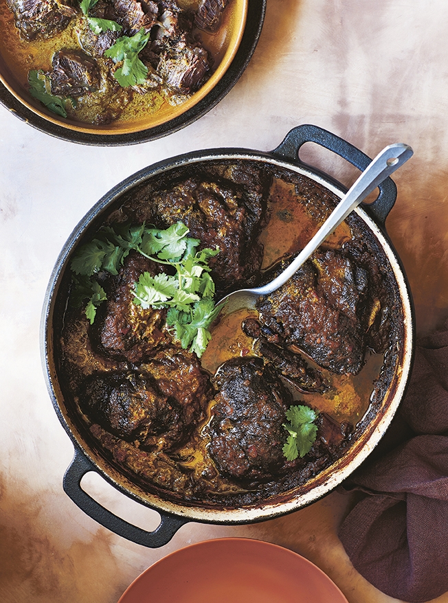 Pour in the coconut milk and add the makrut lime leaves and whole spices. Cover with a lid and transfer to the oven for 3-4 hours or until the meat is tender and the sauce has thickened, stirring occasionally to prevent sticking.