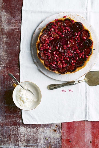 Turn the tart upside-down on to a serving plate. Top with the pomegranate seeds and serve with the cottage cheese in a small bowl on the side.