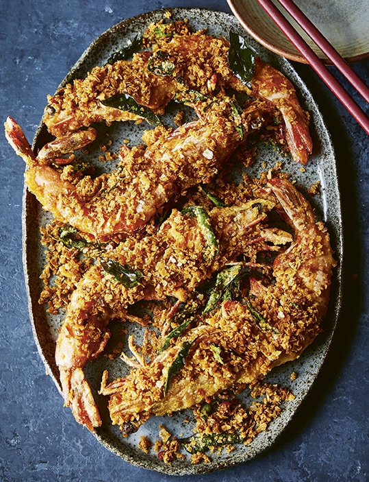 Heat some oil in a wok over a medium-high heat until it reaches 170-180C on a cook’s thermometer, or tiny bubbles gather around a wooden chopstick inserted into the oil. Add the prawns and deep-fry, turning, for 2-3 minutes until bright red and the flesh is opaque. Drain on kitchen paper, discard the excess oil and wipe the wok clean.