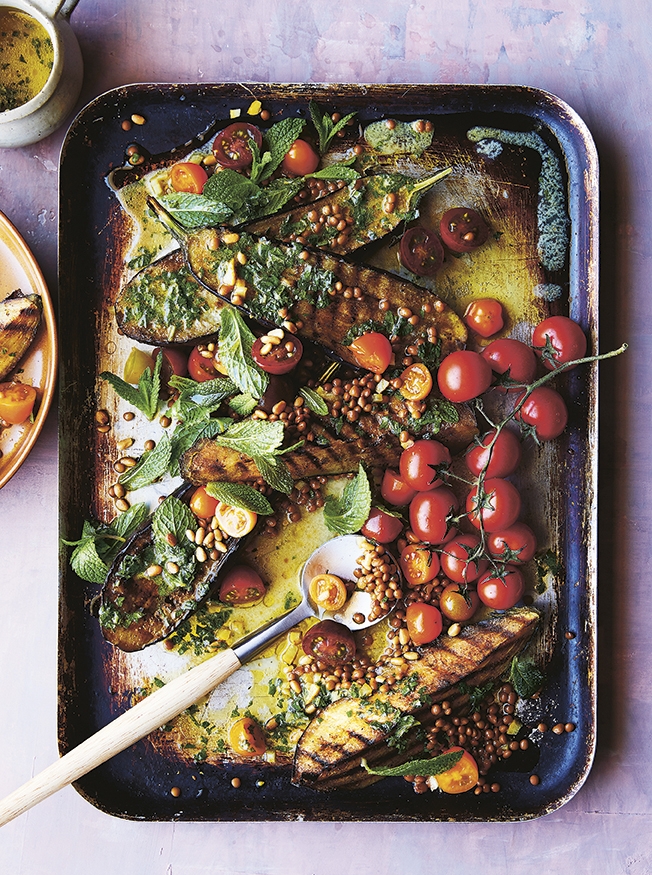 In a serving dish, combine the lentils, aubergines, tomatoes and lemon, if using. Drizzle with the dressing and toss lightly to mix. Garnish with the pine nuts, the feta, if using, and mint leaves. Season to taste, then serve.