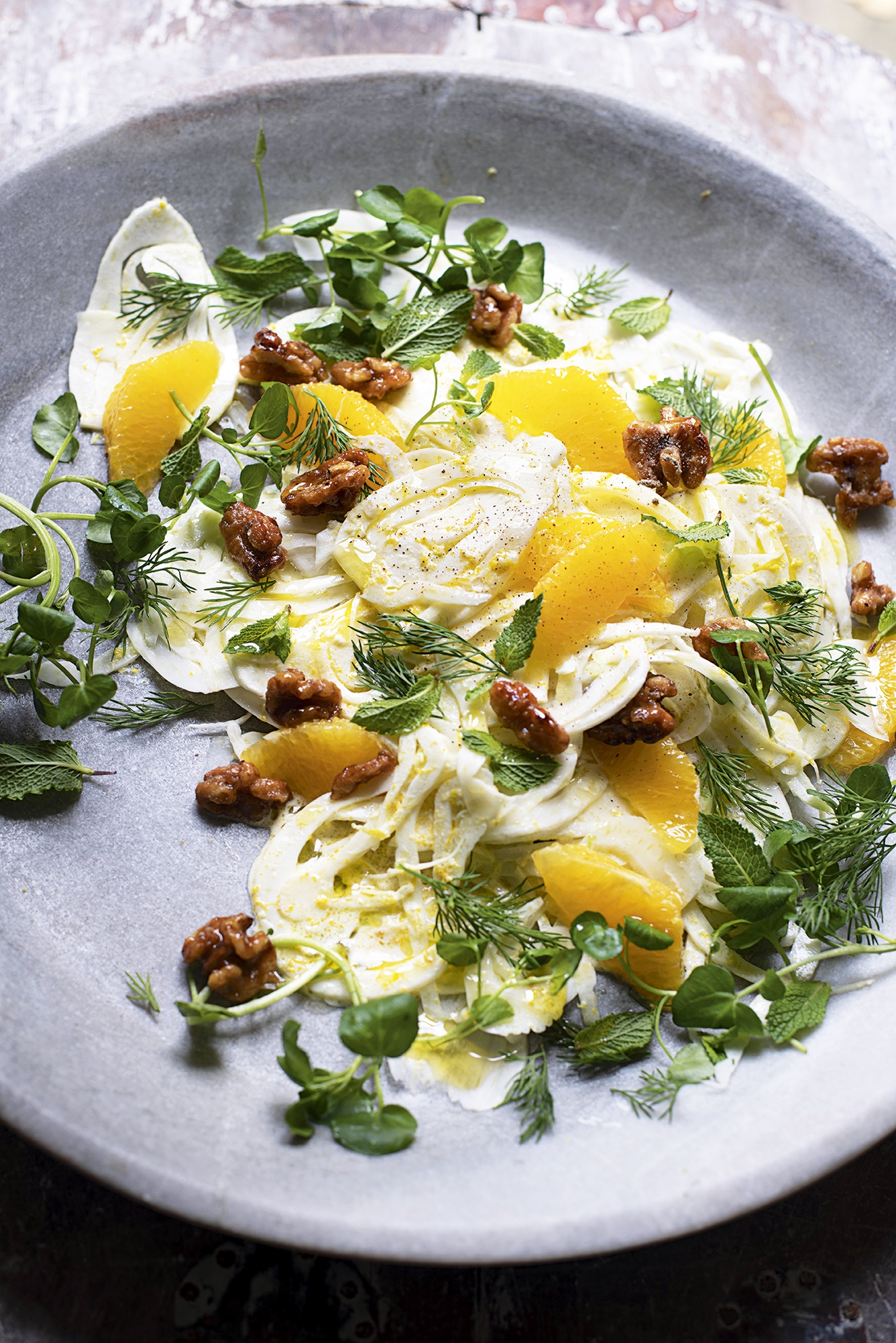 Spoon into a bowl or on to a serving plate and scatter the dill fronds and mint leaves all over, followed by the orange segments and the candied walnuts. Add a drizzle of olive oil, season to taste with more sea salt and freshly cracked black pepper, then serve.