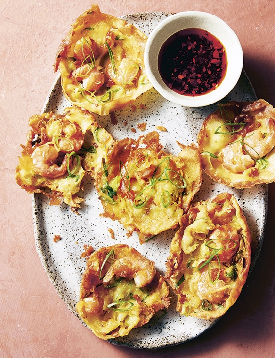 Gently lay a stainless steel ladle in the hot oil and heat for 3 minutes. Remove the ladle, scoop some batter into it and arrange a few prawns on top. Gently return the ladle to the hot oil and cook until the fritter slides off it. Use chopsticks to gently turn the fritter over to cook on the other side for 3 minutes until crispy. Remove and drain on kitchen paper. Repeat with the remaining batter and prawns. Sprinkle with extra spring onions and serve with the chilli sauce.