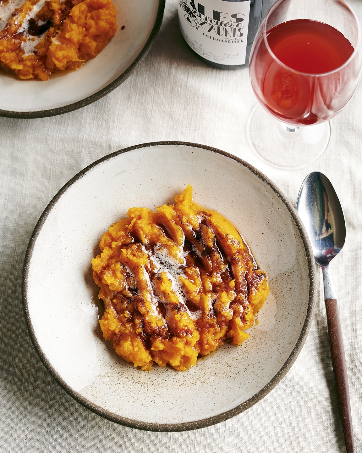 In a separate small pan, warm the brown butter. Rewarm the squash, taste and add a bit more sea salt if needed, then divide between four bowls. Make some indentations in the top of the squash with the side of a fork, spoon the brown butter over so it runs into all the nooks and crannies, then spoon over the vincotto. Sprinkle with sea salt flakes and serve immediately.