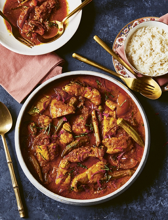 Add the fish and cook for a further 8 minutes or until it is nearly cooked through, then add the okra and salt – the flavour you are looking for is predominantly sour with a hint of sweetness. Remove from the heat and allow to cool on the stove for 5 minutes before garnishing with the extra ginger flower and mint, if using. Serve with the rice.