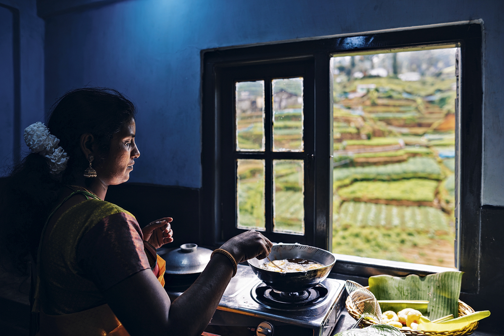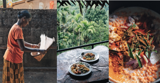 Although every Hill Country local lives alongside tea, not everyone works with it. Along the coiling road from Amba, plastered with pictures of the newly elected president’s youthful, hopeful face, is Wineetha Manathunga’s home cooking school. In a sliver of a kitchen the colour of a pandan cake, five women are busy boiling, grinding, stoking, watching.