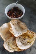 It’s a market best explored by tastebud, to occasional detriment. Wrenched open, the resoundingly brown wood apple reveals bletted flesh. The texture is disturbingly overripe, gummy and bristly. Alone, it tastes like soured mulch, but it’s hugely popular in Sri Lankan drinks and smoothies. Far better are two indigenous fruits: the gaduguda and gal siyambala. The latter is known as the pebble tamarind: a grape-sized fruit with a crisp, velvet shell. Cracked apart, the thin layer nibbled off its seed is like a delicacy of sherbert and suede. The gaduguda is inordinately diverting, its hard skin hiding three translucent bubbles of flesh. Alien-like and surprisingly malleable, they burst with flavours of lychee, creamy lime and sweet acidity.