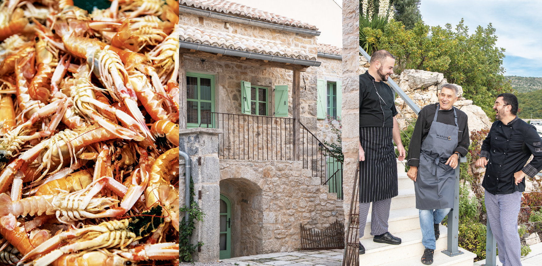 The best ones are caught with vrša fish traps – fishing equipment made from brushwood or wire netting with one or two holes through which fish can enter the trap – as this does not damage the seabed or the langoustine itself. ‘The largest ones are just briefly grilled,’ Vjeročka continues. ‘The middle-sized ones are delicious in a buzara-style stew, a thick soup with lots of garlic, parsley and tomato and a few breadcrumbs to thicken it.’