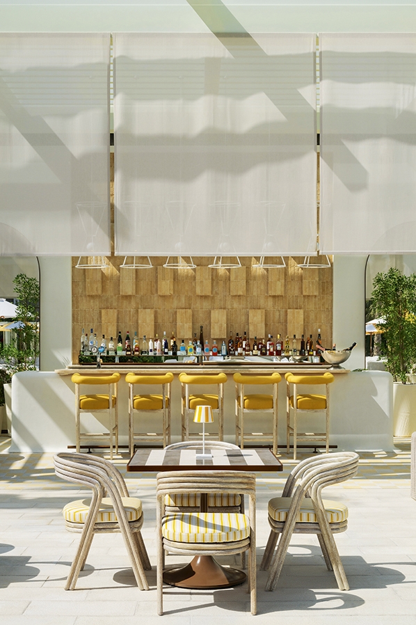 With a palette of egg-yolk yellow and crisp white, the hotel has 251 rooms over seven floors. All routes lead to the pool, where the action unfolds. The cabana-lined space has been curated with downtime