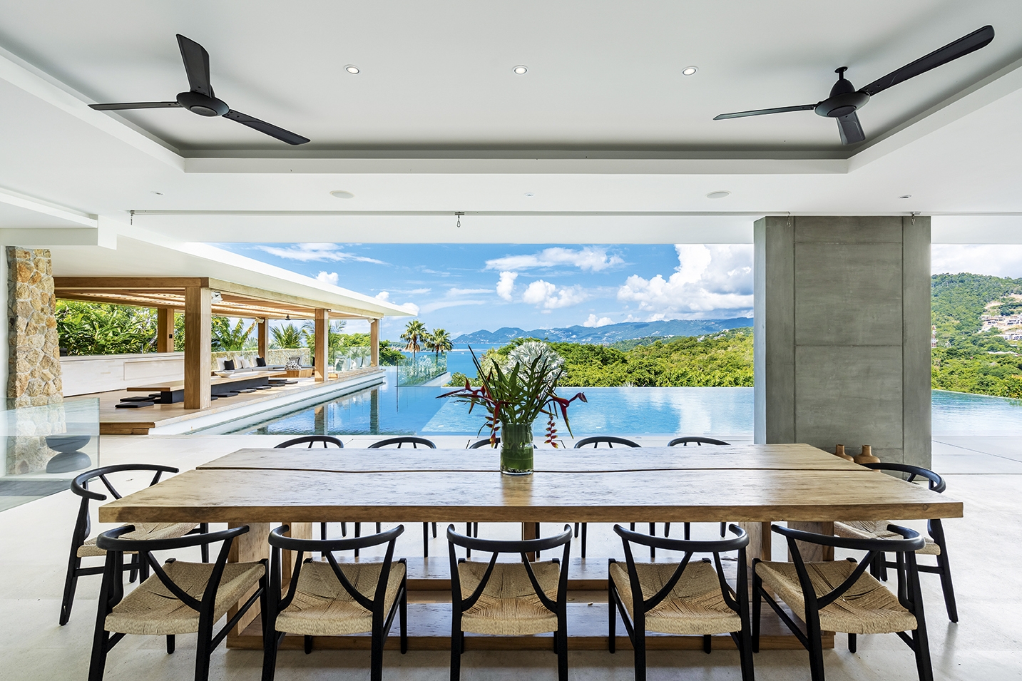 prepared by a private chef, served overlooking the vista – a big bonus for family holidays. Sun worshippers and adventurers are all well catered for, with a private cove to just flop and read, or the option to explore beyond aboard Samujana’s 43ft catamaran.